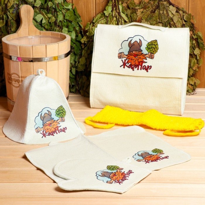 Для комфортного отдыха в парной возьмите с собой набор банных принадлежностей. Предметы из этого комплекта предохраняют тело от перегрева и являются средствами индивидуального пользования. Влажные изделия рекомендуется сушить в расправленном виде на горизонтальной поверхности. Принадлежности из войлока и фетра стирайте вручную при температуре воды 30 °C.